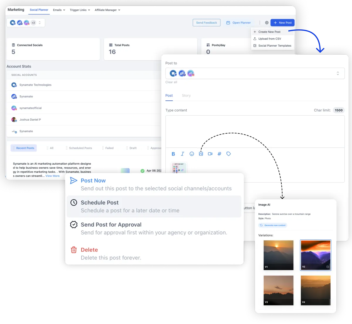 Plan and schedule posts, stories, reels(coming soon) across facebook, instagram, linkedin, twitter.